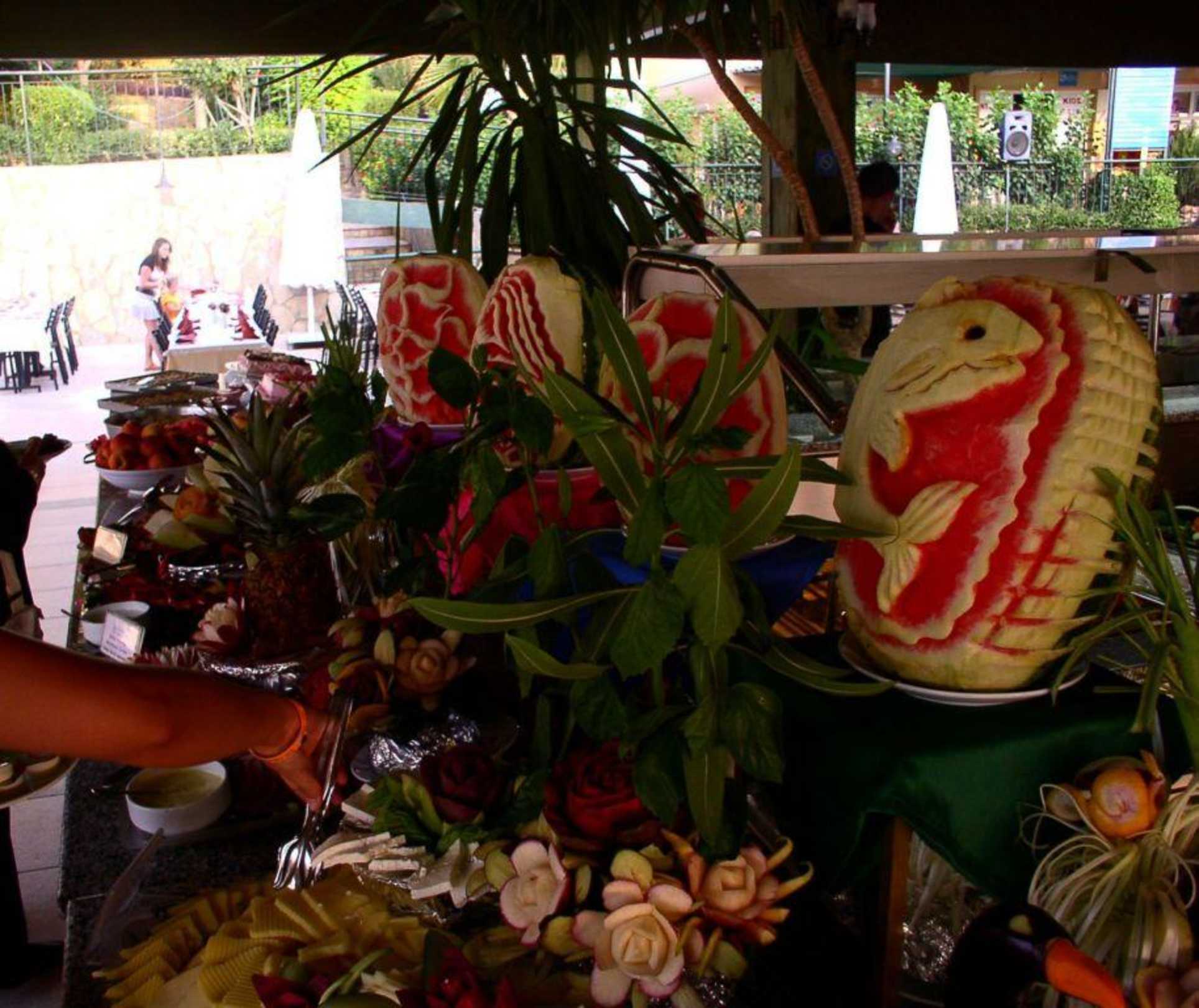 Food in main restaurant. On picture you can see only one table but there is a few tables in that restaurant. A very nice bas-reliefs made from watermelons.