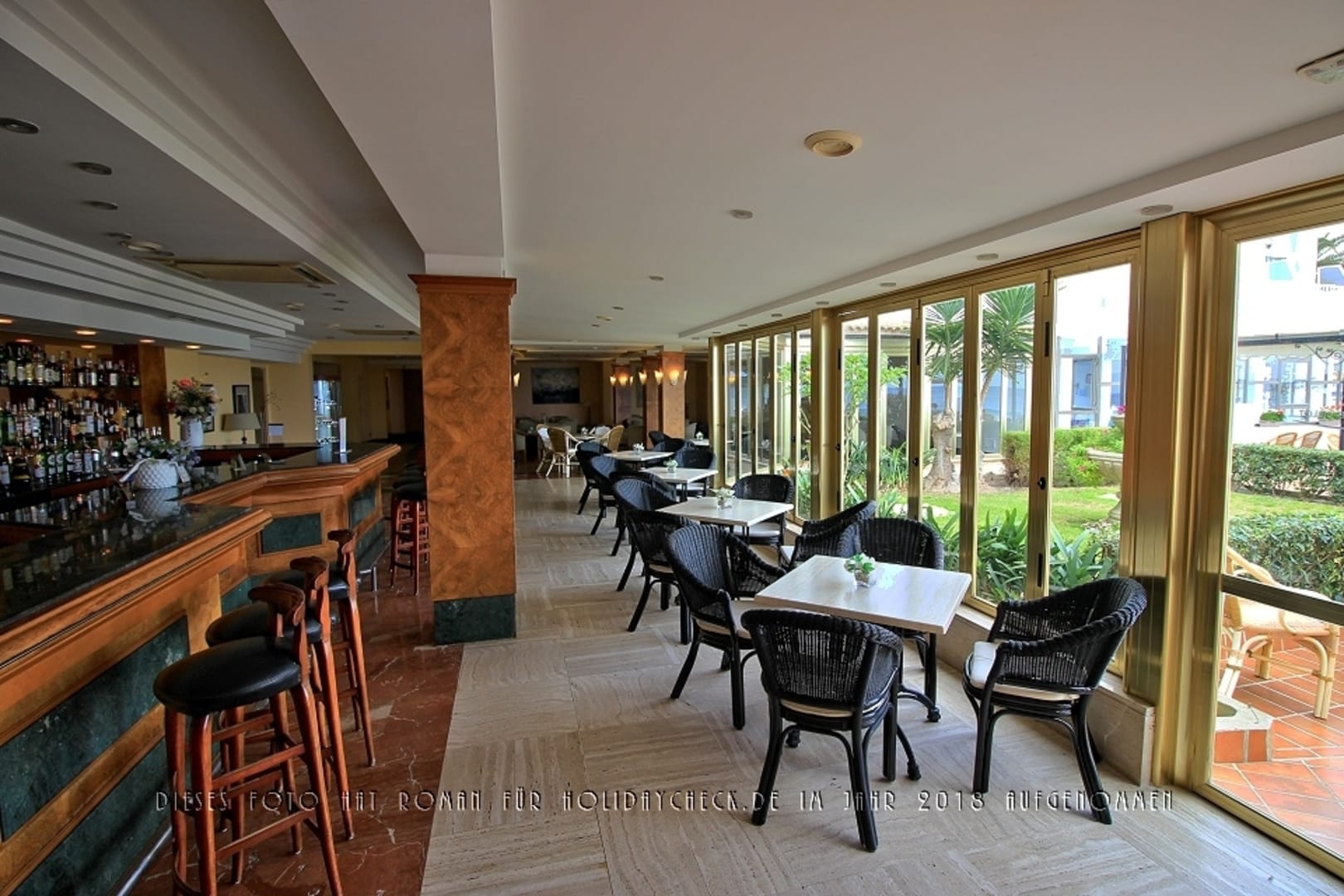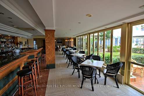 Vom Speisesaal herkommend Blick auf die Lobby mit der Bar auf der linken Seite und die Stühle und Tische der Lobby, die einen faszinierenden Meerblick bieten.