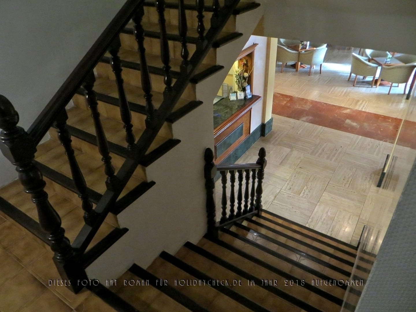 Blick vom Zwischengeschoss des Treppenhauses zur aufwärts führenden Treppe zur Etage 1 sowie der abwärts führenden Treppe zur Lobby und der Rezeption.