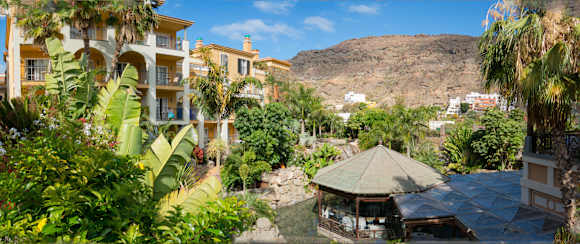 Restaurantbereich (außenansicht)Das Überdachte Areal rechts unten im Bild ist eine Art Wintergarten, welcher zum Hauptrestaurant gehört. Rechts oben erkennt man die Holzbalustrade des á la carte-Restaurants "Los Guayres". Das Restaurant ist von einer Wasserlandschaft umgeben.