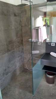 Ebenerdige Dusche + rechts daneben Waschbecken