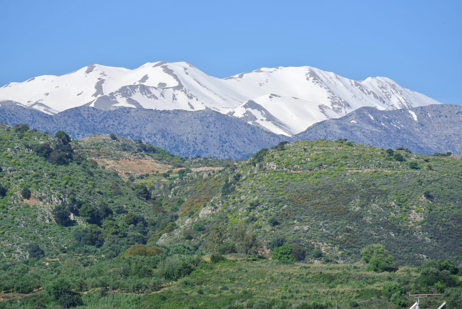 Blick aus dem Zimmer auf die weißen Berge