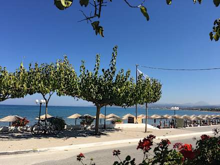 AusblickDer Blick vom Corissia Park wo die Mahlzeiten eingenommen werden, ein Pool vorhanden ist und man auch Getränke konsumieren kann. Man sieht den Strandabschnitt der zum Hotel gehört mit den Liegen und Schirmen