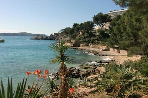 Mini - Sandstrand an einer schönen terassenförmigen Gartenanlage