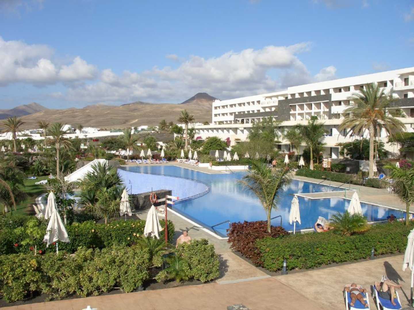 Es gibt Pools auf zwei Ebenen. Das Bild zeigt den oberen Süßwasserpool, einen Teil des Hotels sowie den Ausblick auf die Berge im Hintergrund.