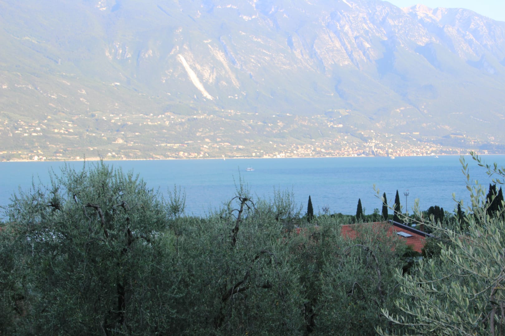Blick vom Zimmer über den Olivenhaiin und Gardasee nach Malcesine