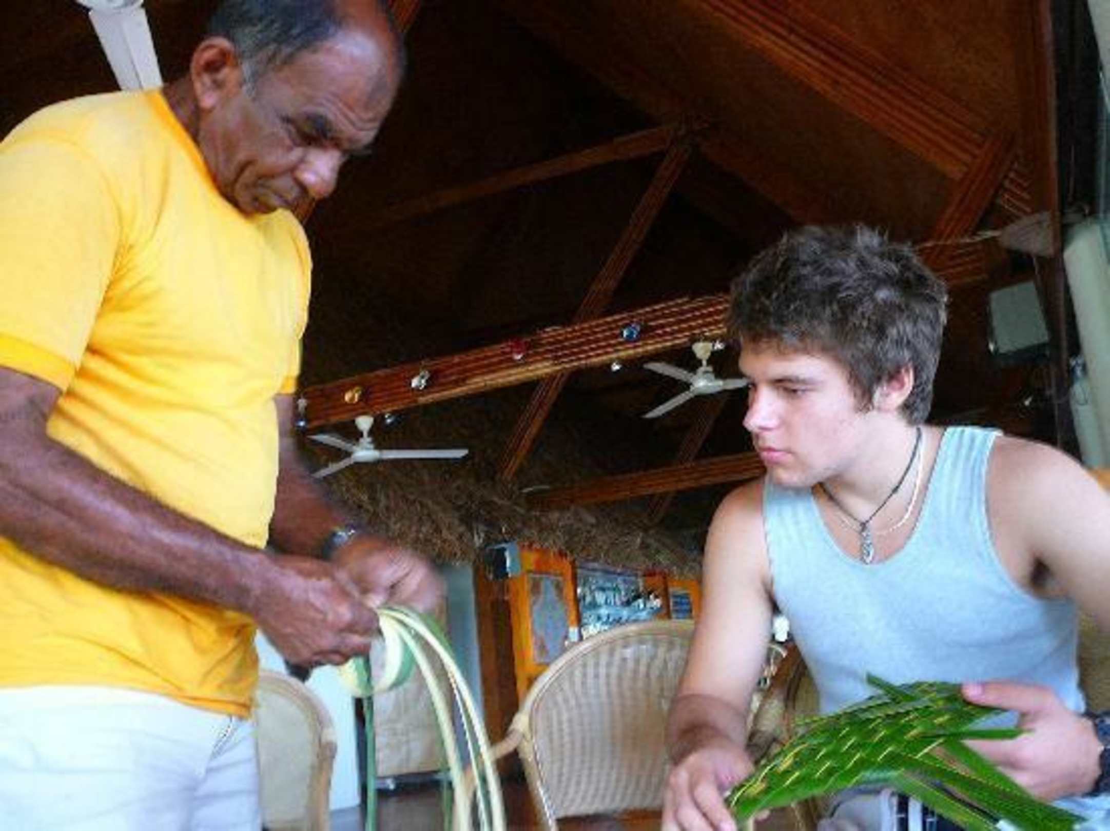 Marli und mein Sohn beim Palmblattflechten