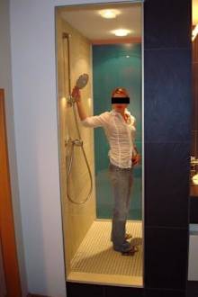 Blick in die Dusche vom Bett aus