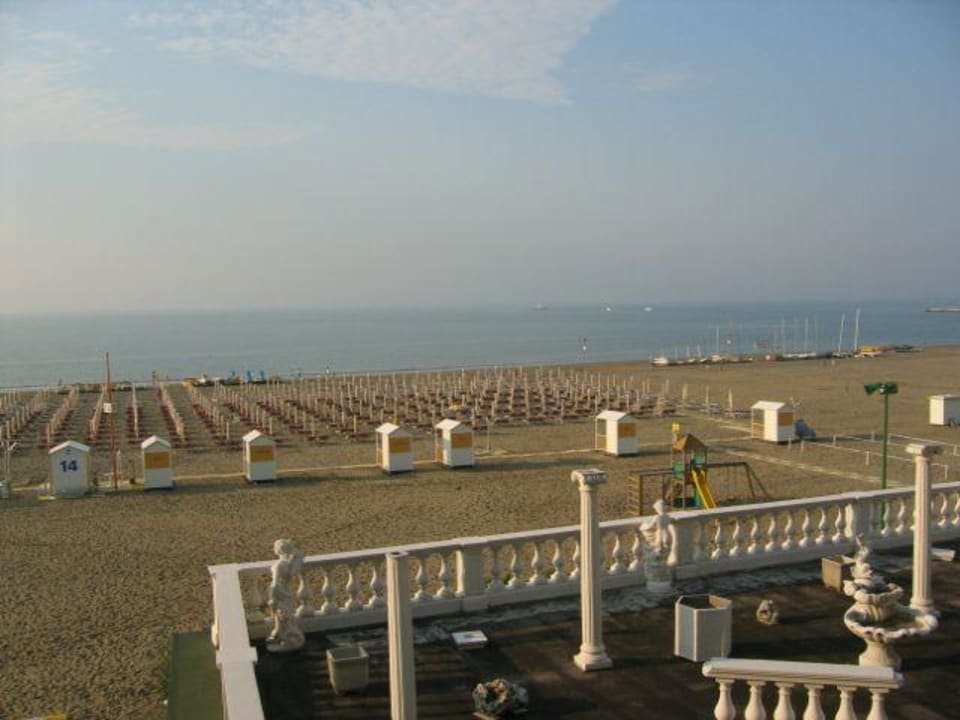 Blick von der Hotelterrasse auf den noch leeren Strand