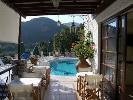 Blick von der Frühstücksterrasse auf den Pool