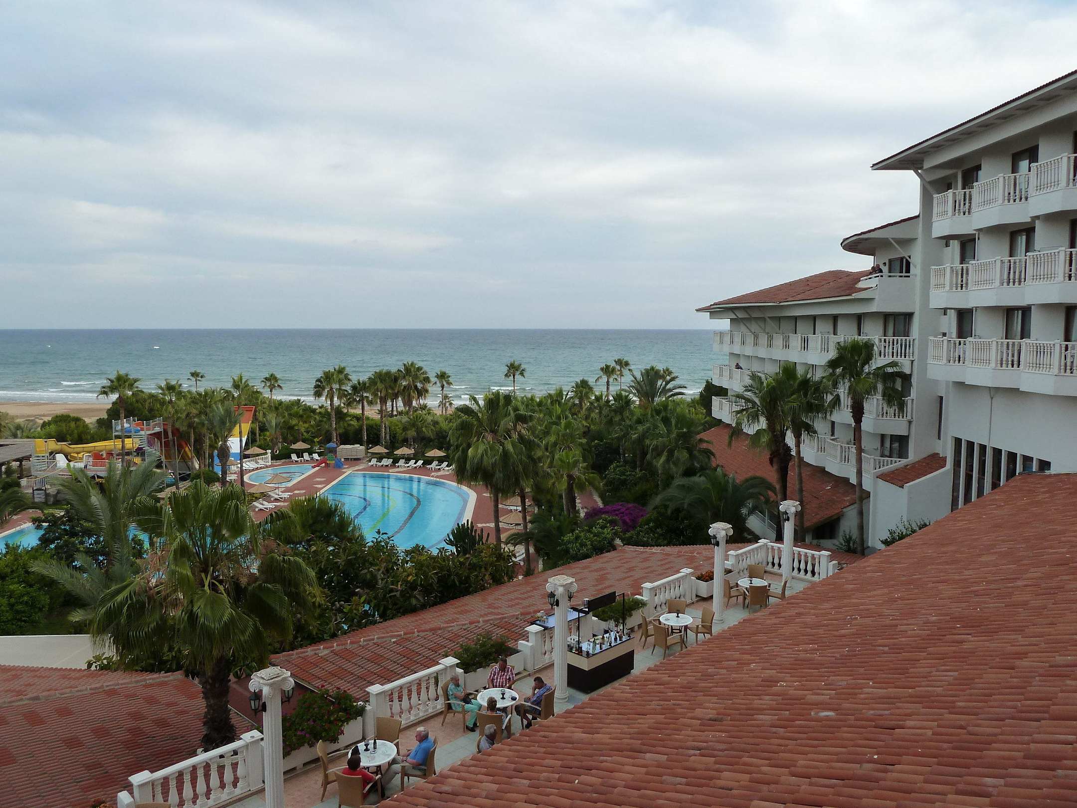 Blick über den Garten und Pool zum Meer
