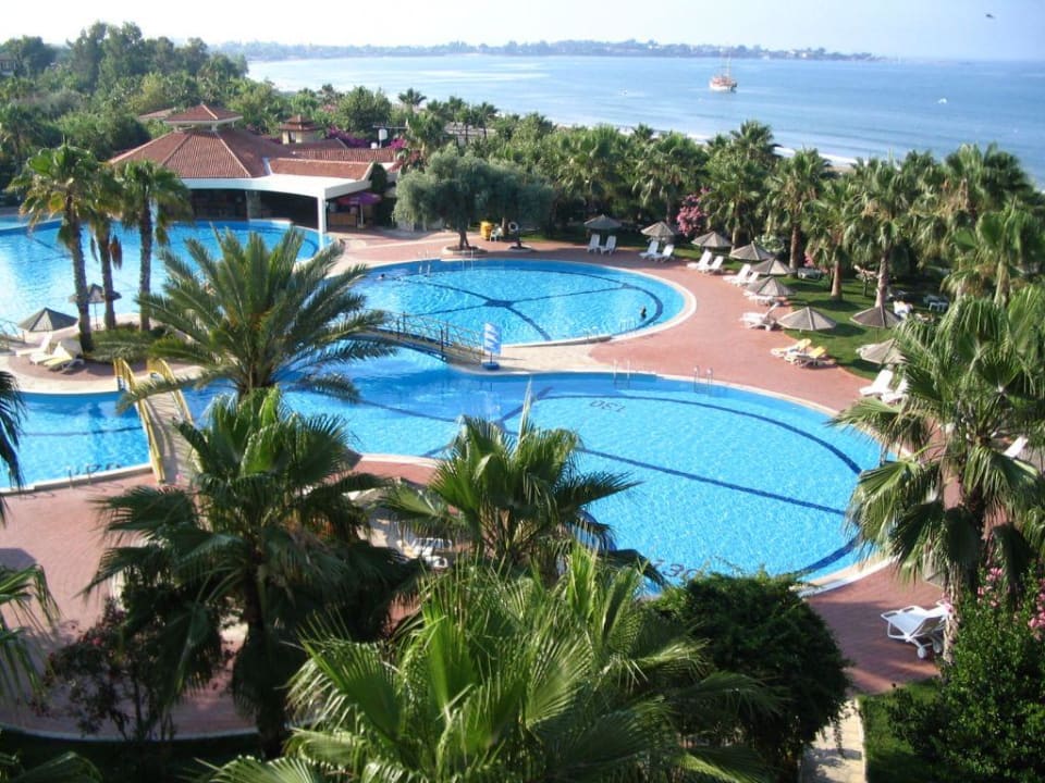 Ausblick vom ZimmerEin traumhafter Ausblick auf den grossen Pool, das Meer und im Hintergrund kann man Side erkennen.