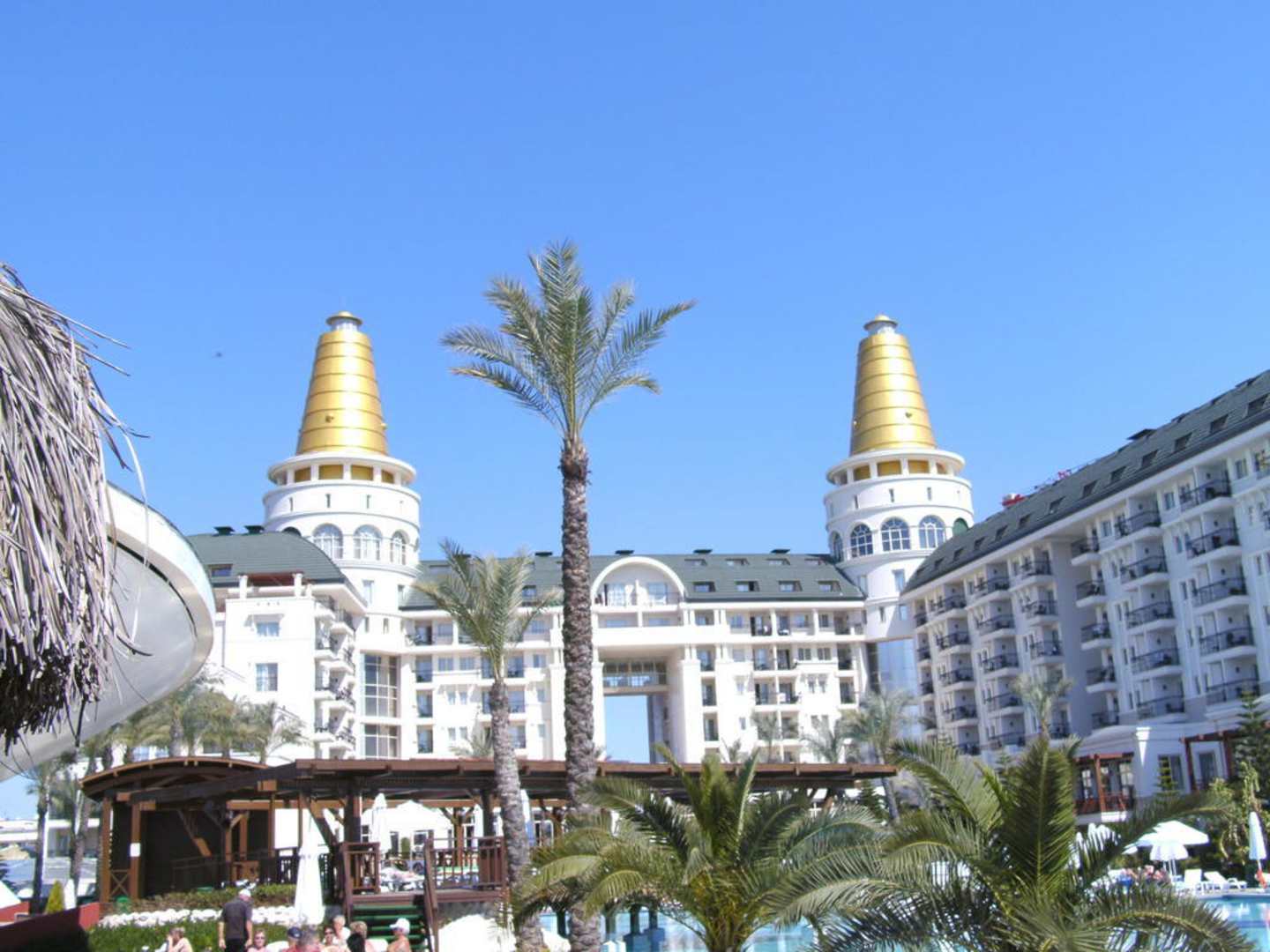 Blick vom Pool auf das Hotel
