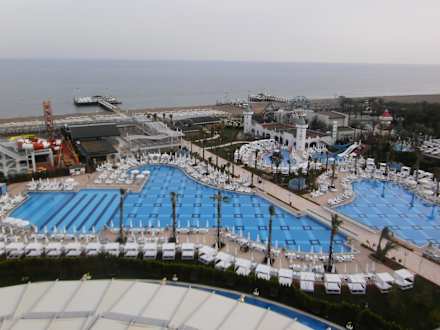 Ausblick auf einen Teil der Poolanlage und Strand