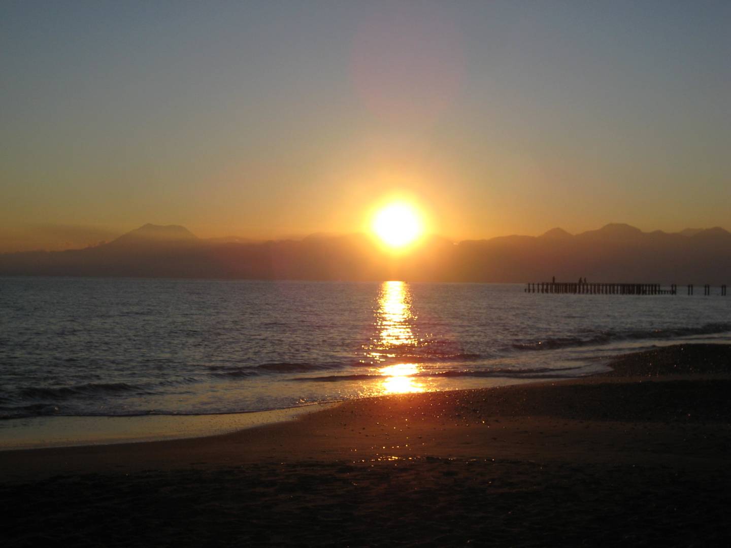 Sonnenuntergang hinter den Bergen beim Spaziergang am Strand