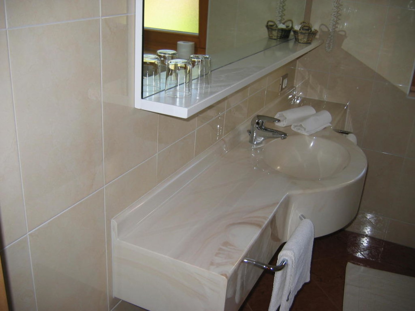 Das große Waschbecken mit dem hellen und gr0ßen Spiegel