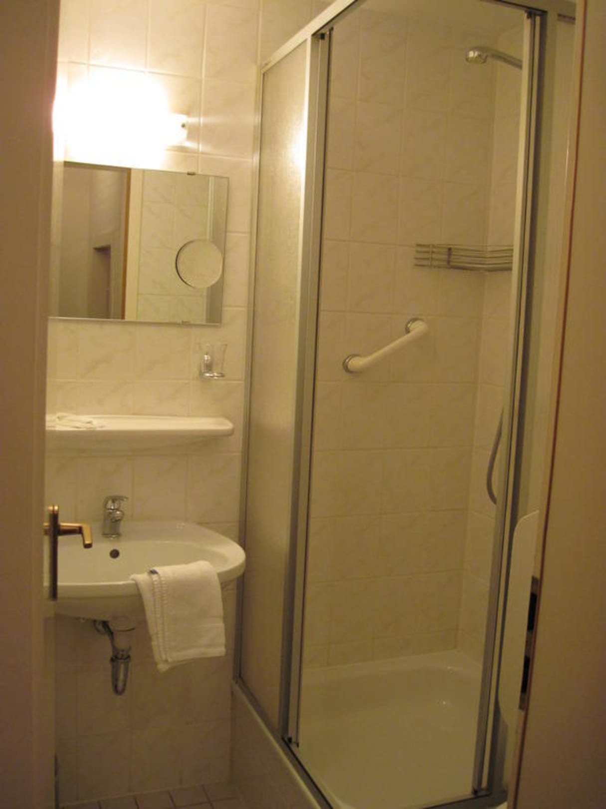 Das Badezimmer ist sehr klein, hat aber alles was man braucht. Mit Fön, Dusche, WC, Kosmetik und die Ablage ist ausreichend für die eigene Kosmetik.