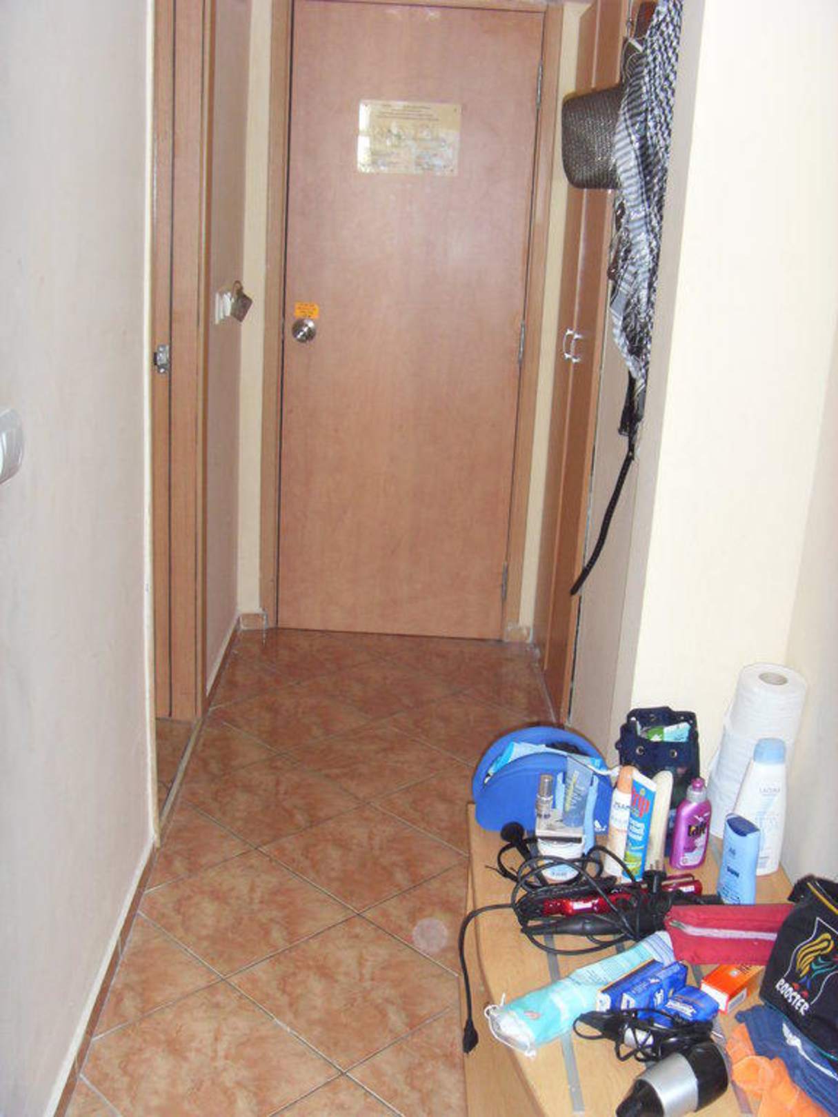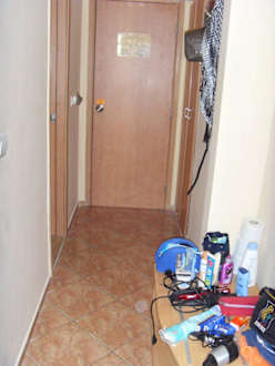 Blick von Zimmer zum Ausganglinks sieht man die Badezimmertür, rechts den Kleiderschrank und die Kommode, geradeaus die Zimmertür
