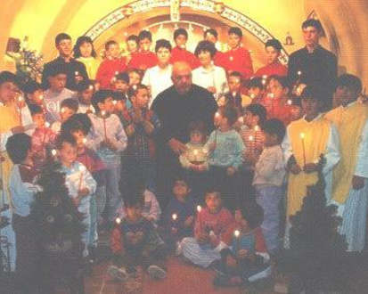 Der Pater mit den Kindern in seiner KapelleInmitten des Dorfes der Kinder hat der Pater eine kleine Kapelle. Viele seiner Kinder sind Messdiener mit Laib und Seele.