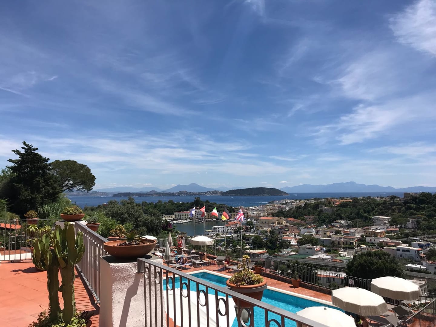 AusblickBlick von der Terrasse auf den Hafen. Dahinter erkennt man die Insel Procida und ganz im Hintergrund sieht man Neapel mit dem Vesuv.