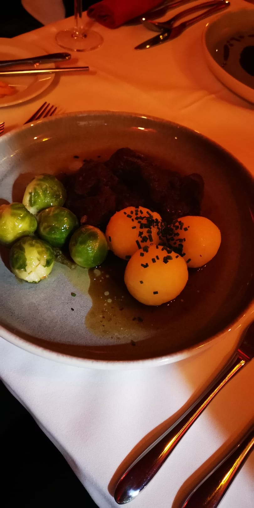Wildgulasch auf Wunsch mit Klößen und leider viel zu hartem Rosenkohl