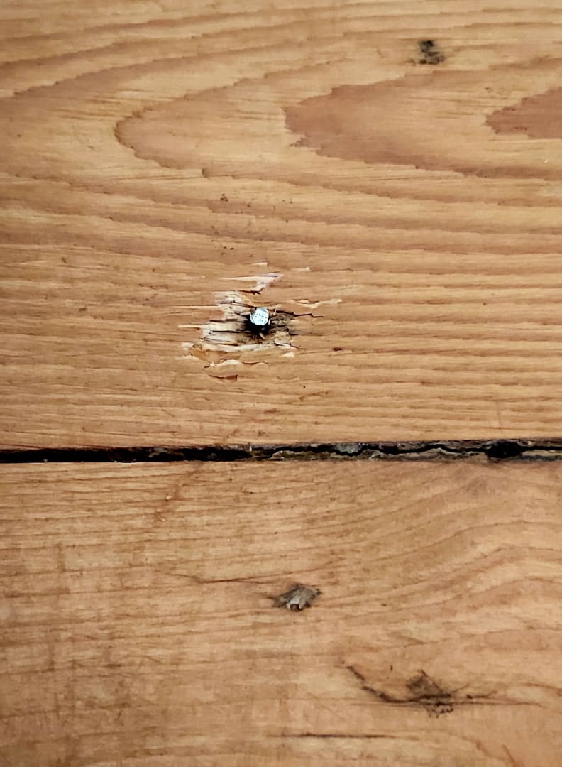 Direkt vor dem Bett kam ein Metallstift aus der Holzdiele, Verletzungsgefahr!
