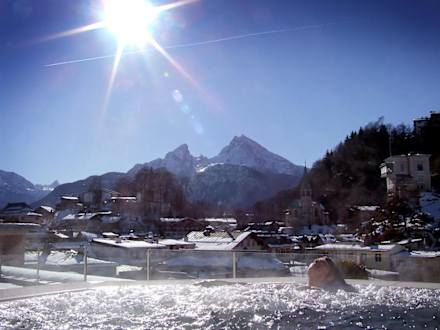 Sicht vom Außenpool zum Watzmann
