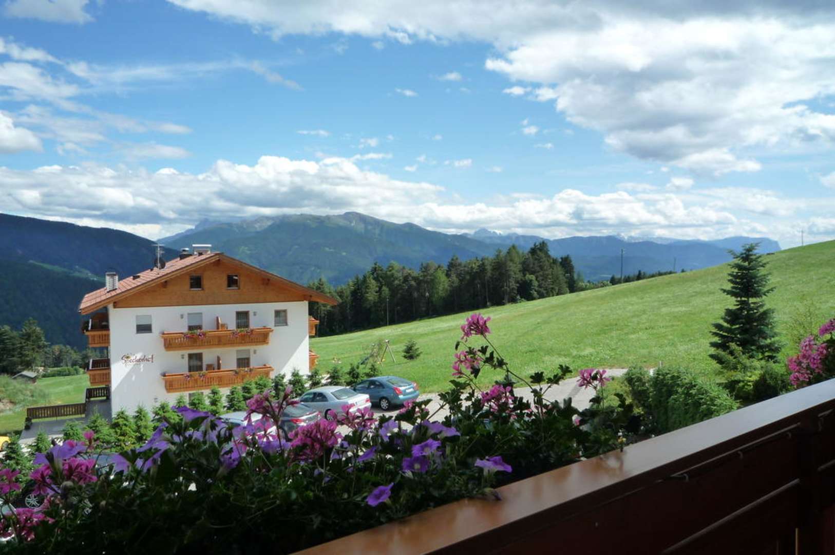 Blick vom BalkonAusblick vom Balkon nach Süden zum Peitler Kofel und Plosemassiv