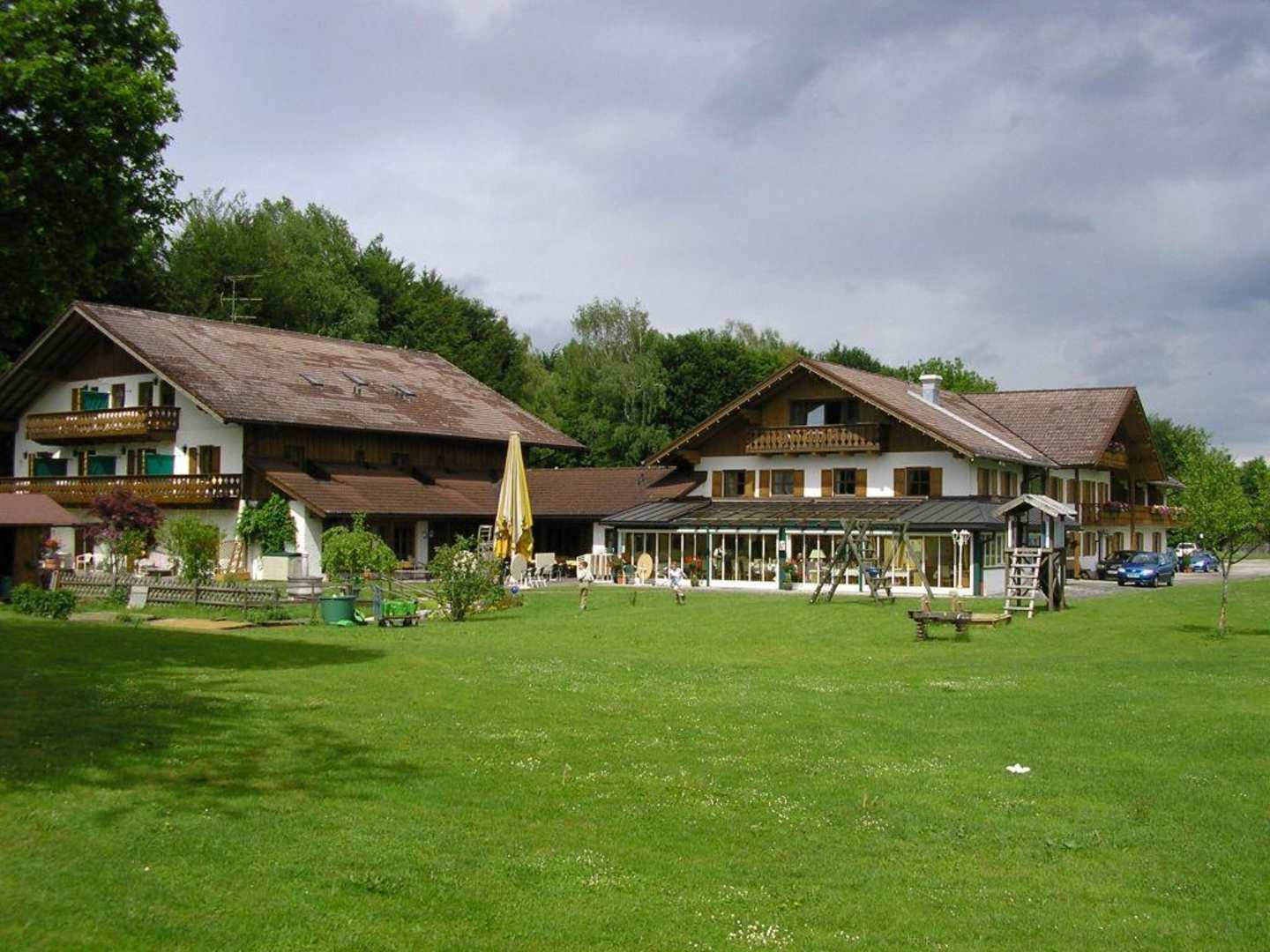 Das Hotel Eichehof in Waging am See, etwa 300 Meter dahinter befindet sich der See, sehr schön gelegen mit Golf-driving-Range zum üben, Kinderschaukel, Rutsche und schönem Garten.