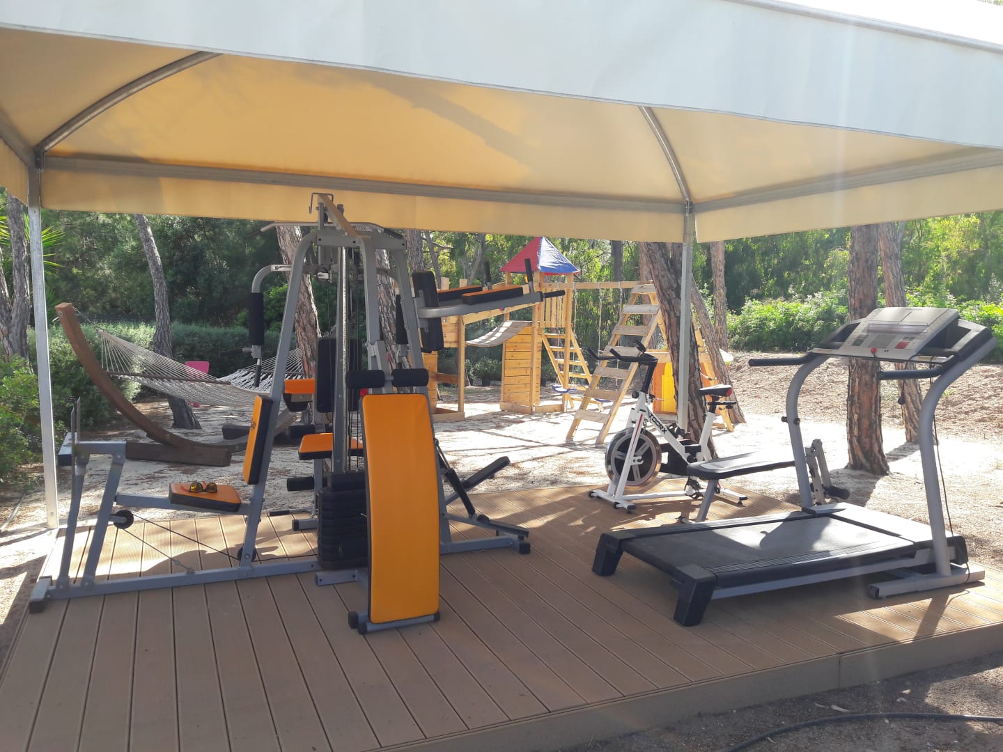 Fitnesscenter im Freien. Die Geräte sind leider wenig gepflegt und staubig.