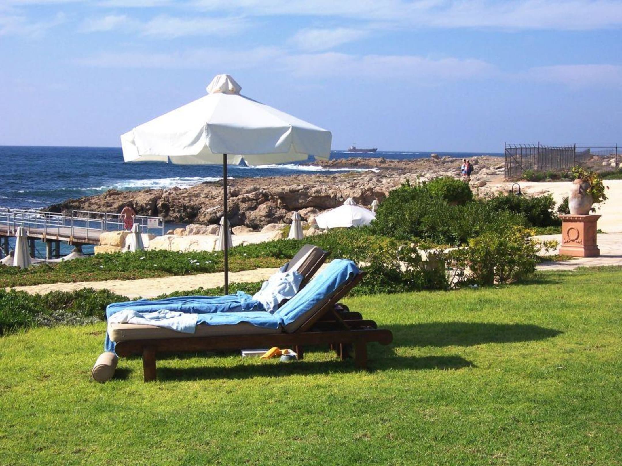 Grosszügige Rasenfläche am Strand mit Blick aufs Meer