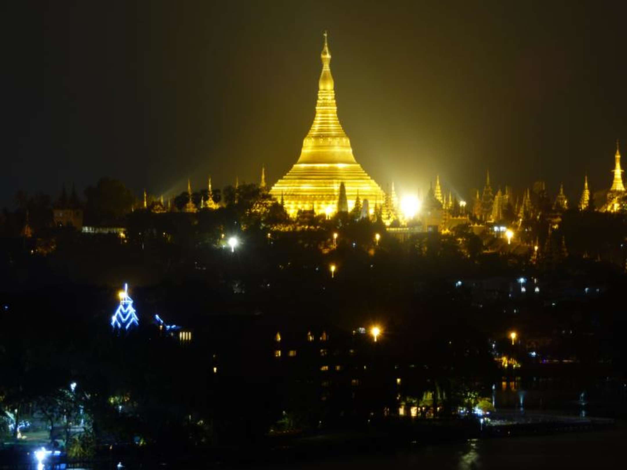 Ausblick von der Dachterasse des Restaurants auf die Shwedagon Pagoda.
