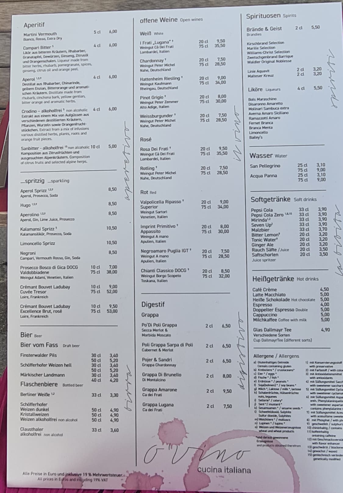 Getränkekarte Restaurant O'Vino