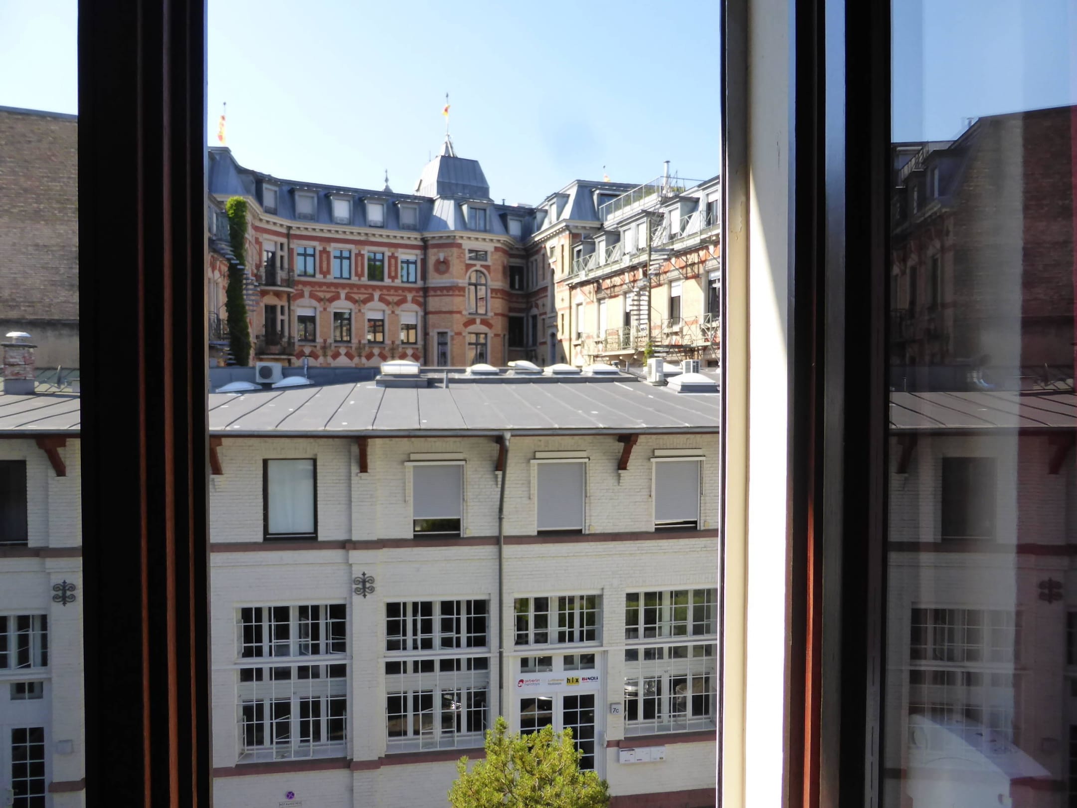 Die Sehenswürdigkeit Goldenes Kreuz im Stil der Gründerzeit. In ihrem Hof (also hinter dem weißen Bürohaus) befindet sich das Sterne-Restaurant Le Jardin de France.