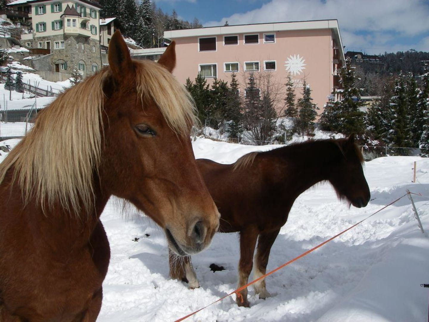 Pferde im Schnee am Hotel Europa