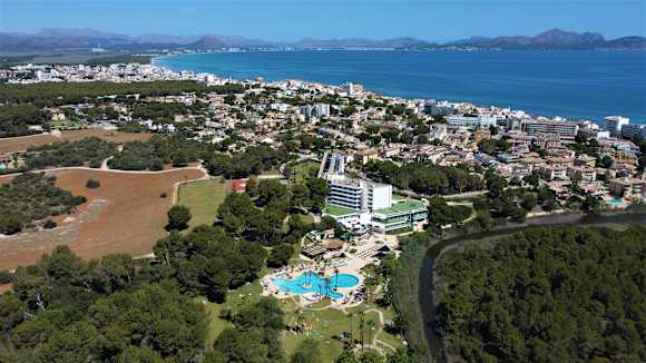 Das Hotel mit Poolanlage im Vordergrund, dahinter der Ort Can Picafort.