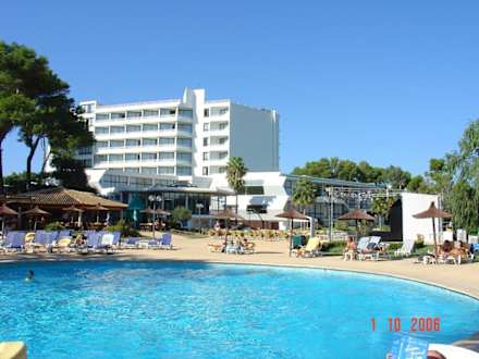 Spanien/ Mallorca/ Can Picafort/ Iberostar Exagon Park// Der Pool mit einem Teil des Hotels, der Poolbar und dem Hallenbad im Hintergrund.