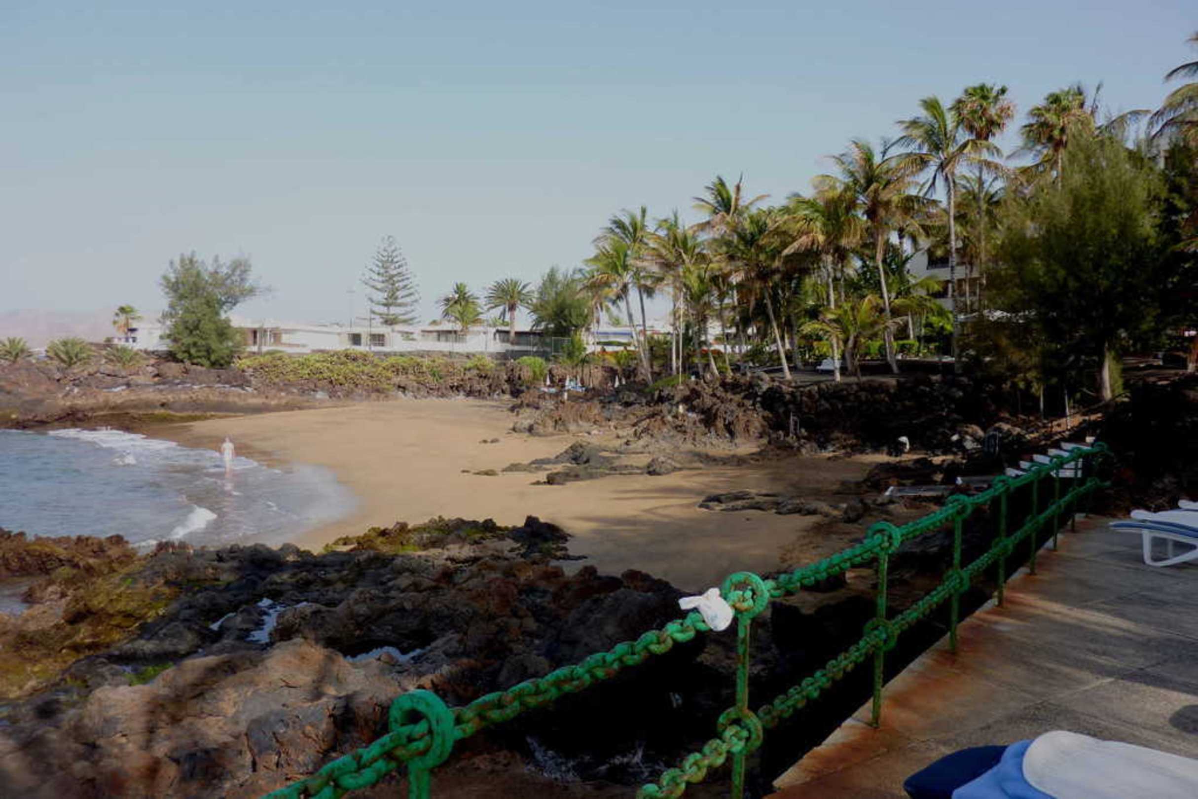 Hotelstrand am frühen MorgenBevor die Einheimischen über die Felsen klettern, sieht es an Strand und Park des Hotels noch friedlich und idyllisch aus.
