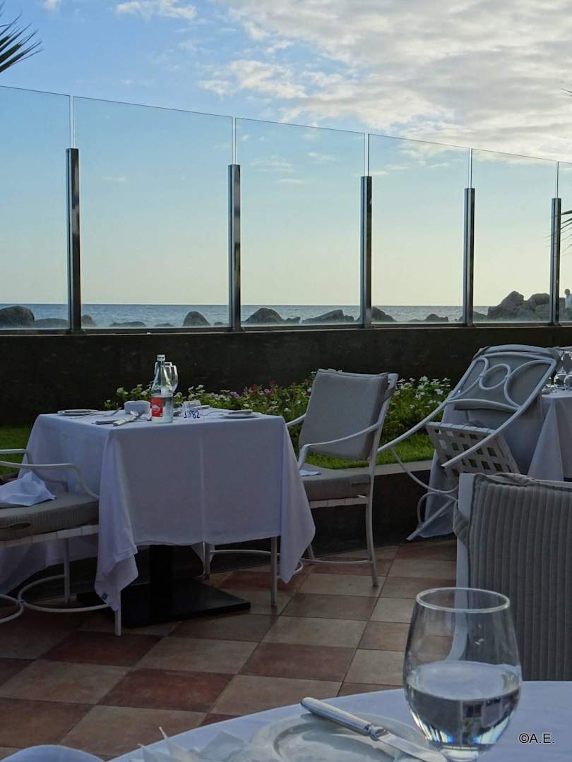 Frühstück im Restaurantgarten mit Blick aufs Meer