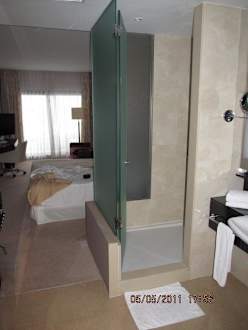 Blick zur DuscheDie offene Sanitäreinrichtung ist nicht Jedermanns Geschmack