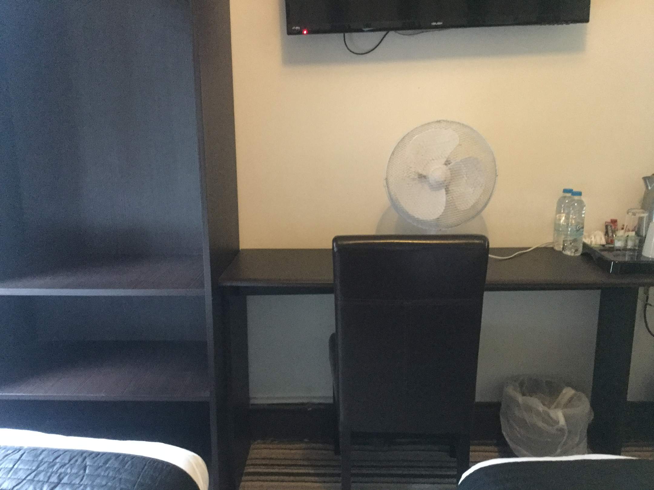 Offenes Regal für die Anziehsachen, Schreibtisch, Wasserkocher, Fernseher