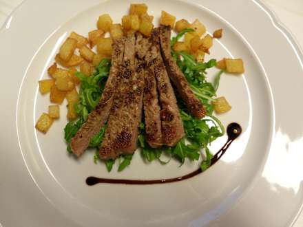 Rindstagliata auf Ruccola mit Kartoffelwürfeln