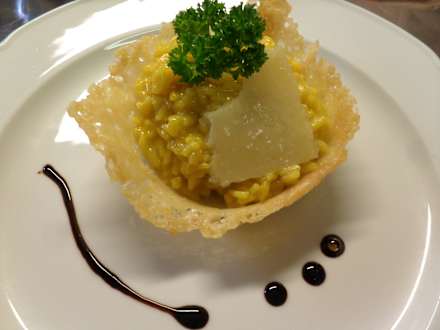 Safranrisottino in Parmesankäsekörbchen