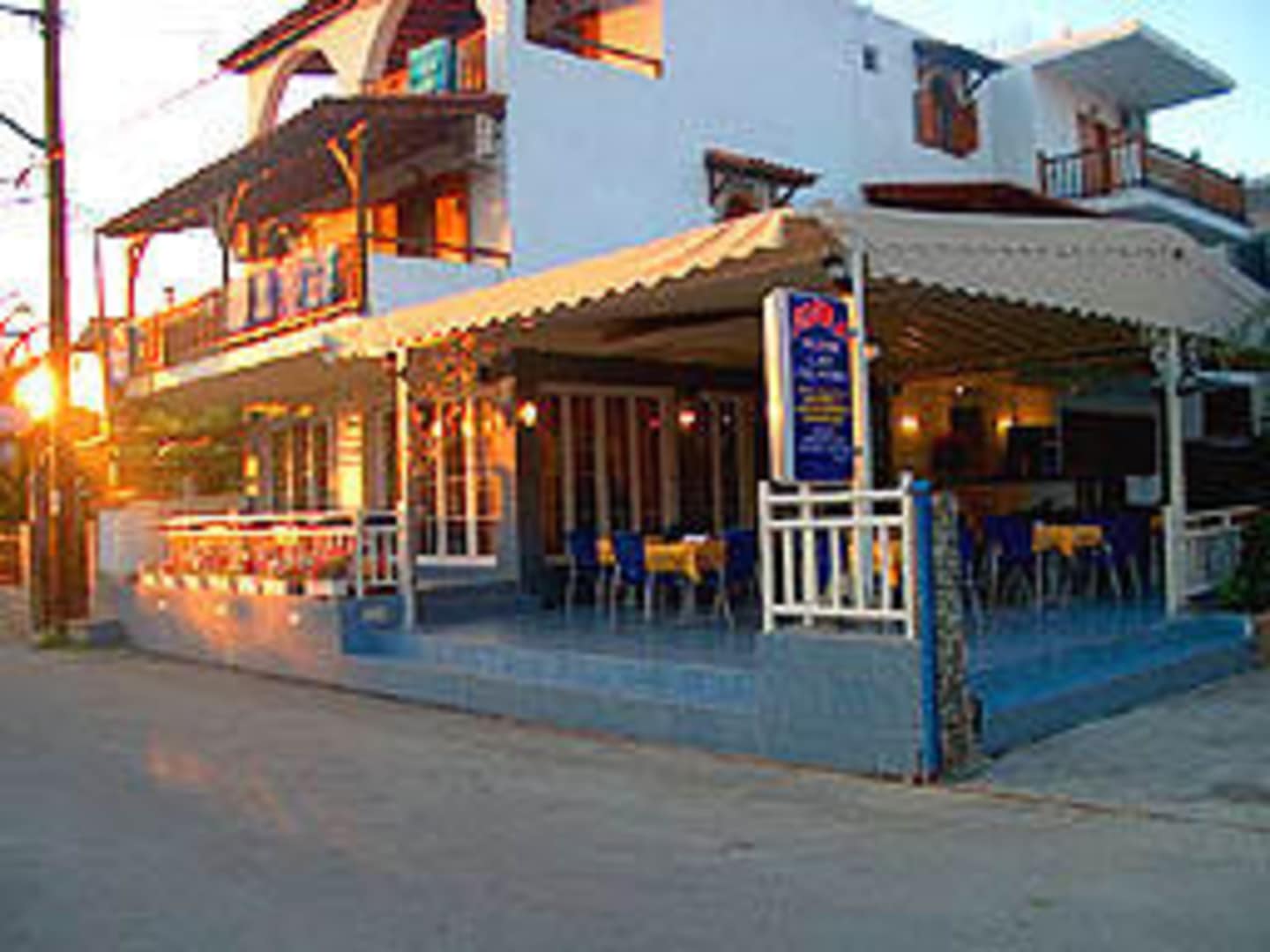 Blick auf die Vorderseite des Hotels mit der Terrasse, auf der auch gegessen wird.