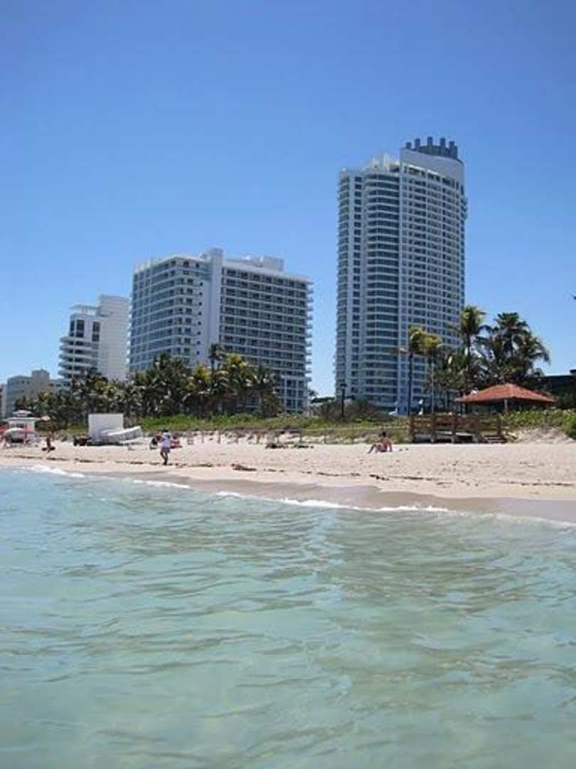 Das Sorrento und der Tesort Tower vom Fontainebleau Miami Beach vom Strand aus.
