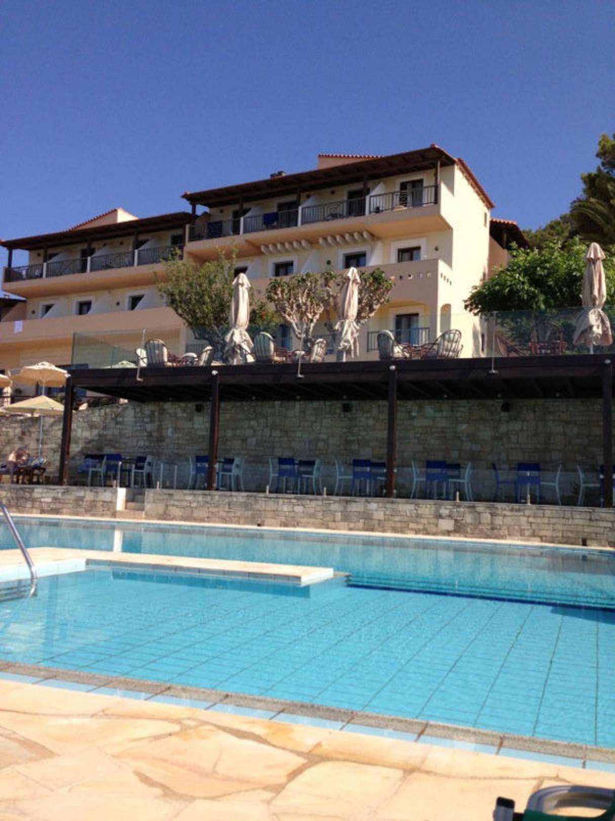 Blick vom Poolbereich auf das Hotel
