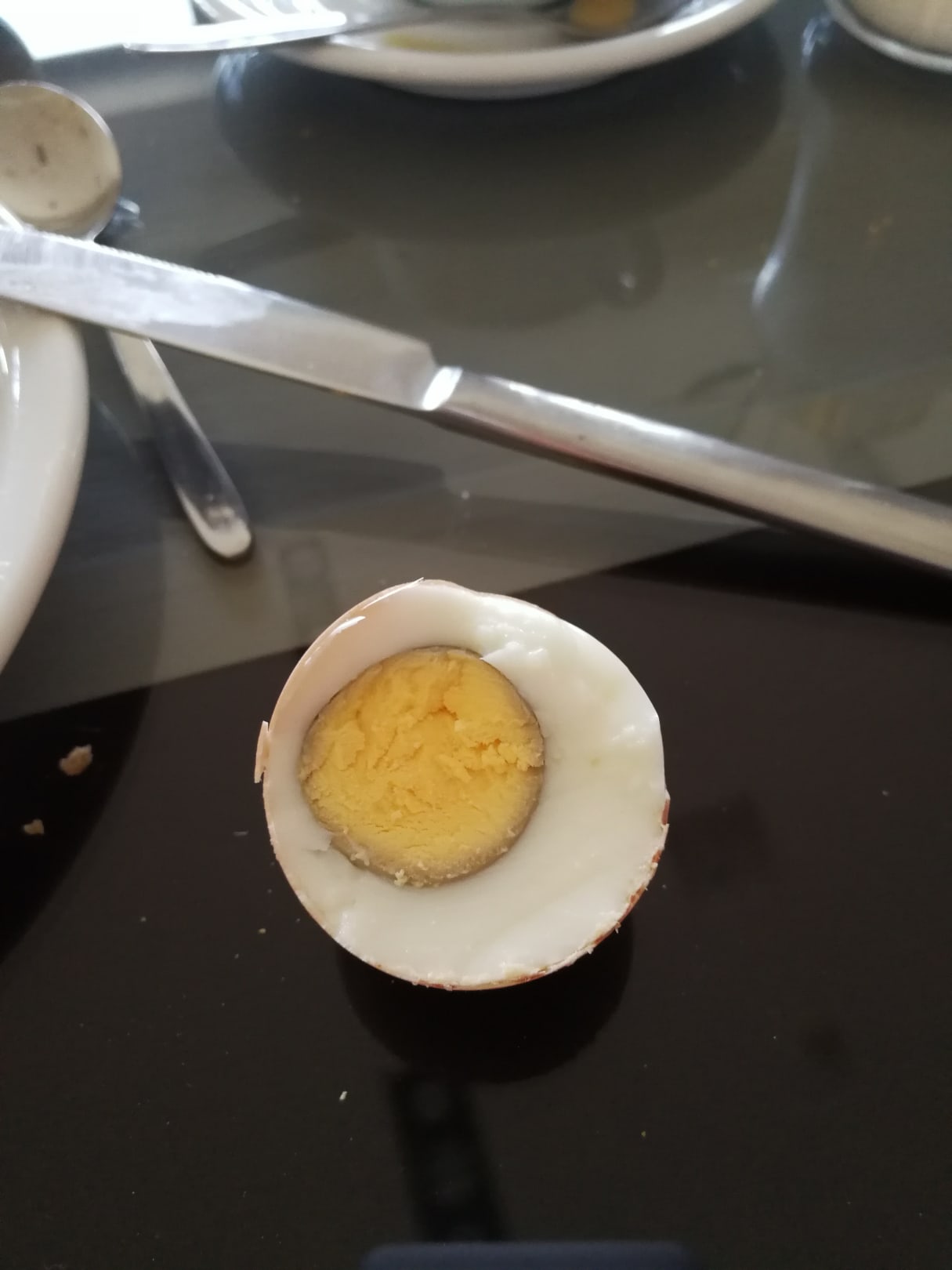 Das mind. 20 Minuten tot gekochte Frühstücksei. Ungenießbar da furztrocken. Hausfrauen wissen wie lange ein Ei kochen muss um diesen blau-lila Rand zu erzeugen.