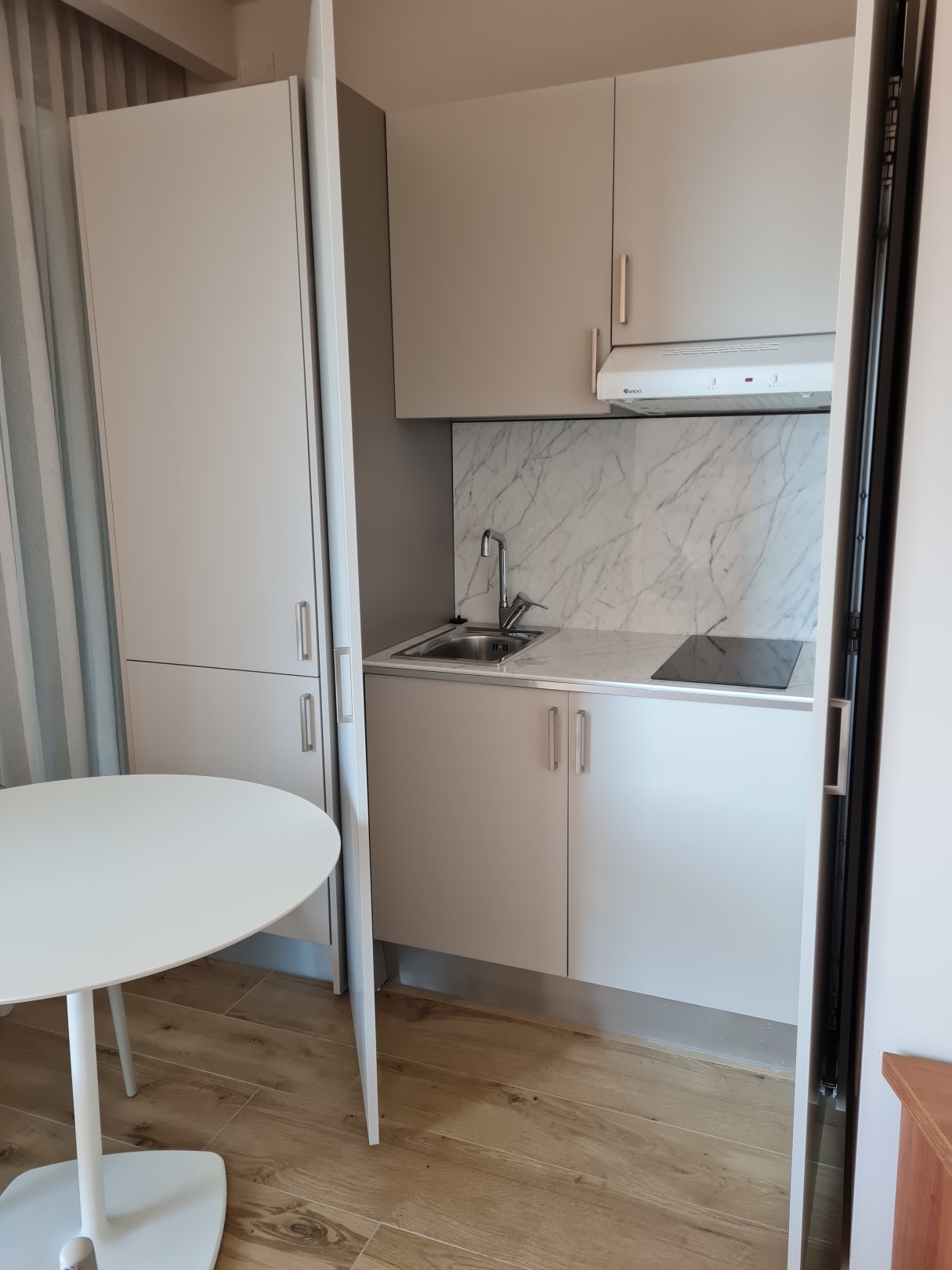 ZimmerSuite mit Terrasse und Seeblick in der Villa Remo - Wohnzimmer, Küchenzeile, Links die Gefrier-Kühl-Kombination