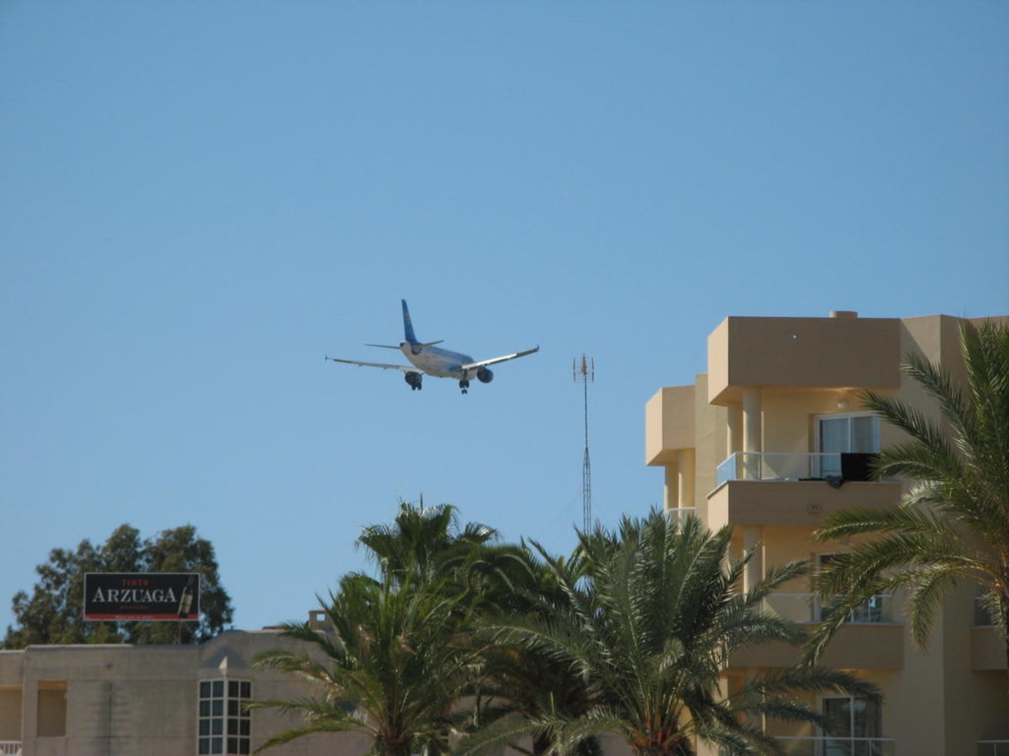 Landendes Flugzeug, aufgenommen vom Strand in unmittelbarer Nähe des Hotels, der Gebäudeteil rechts im Bild ist ein Flügel des Hotels "Garbi".