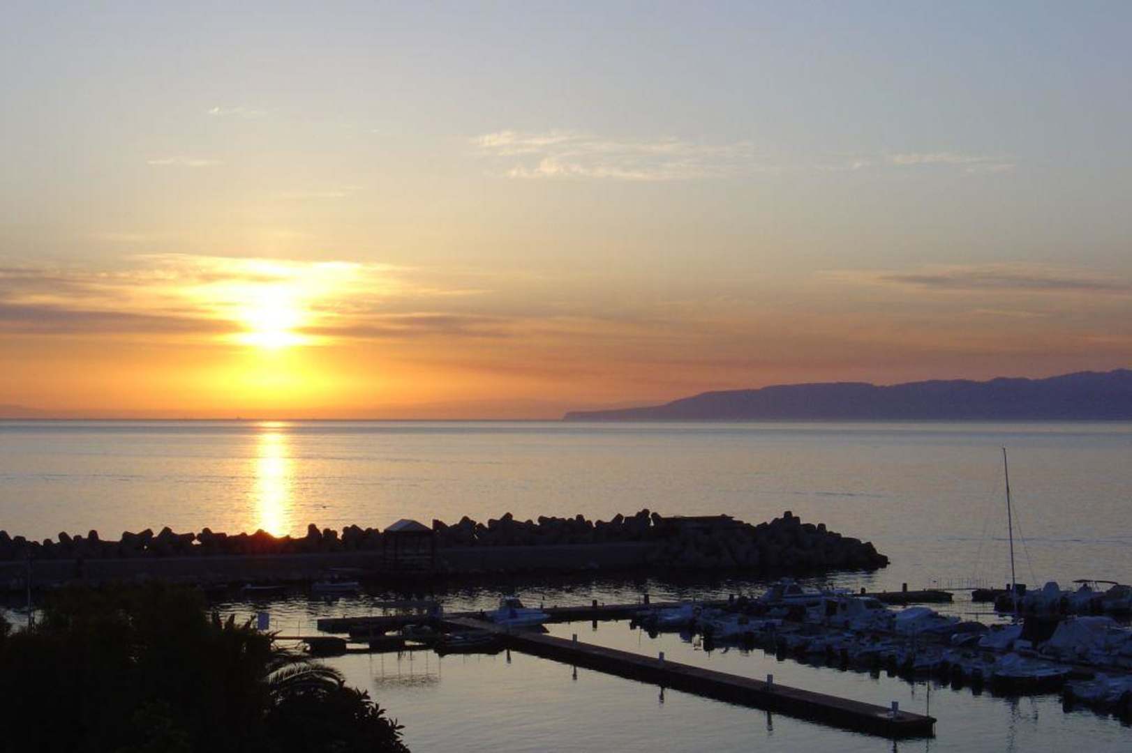 Sonnenaufgang über dem Fischhafen von Milazzo vom Hotelbalkon aus gesehen